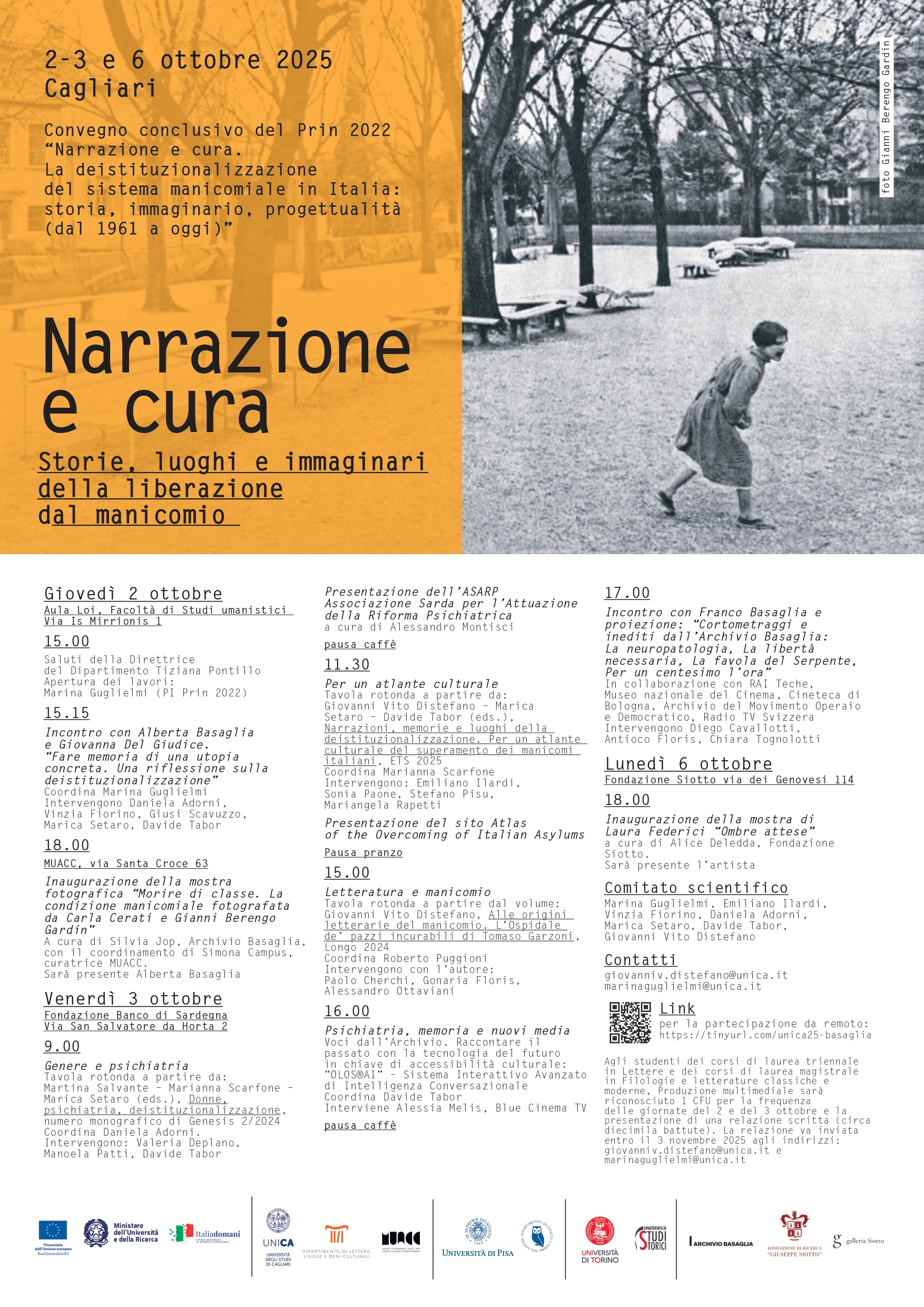 Dal 2 al 6 ottobre 2025 si terrà a Cagliari il convegno conclusivo del Prin 2022 dedicato a “Narrazione e cura. La deistituzionalizzazione del sistema manicomiale in Italia: storia, immaginario, progettualità (dal 1961 a oggi)”, promosso dal Ministero dell’Università e della Ricerca.