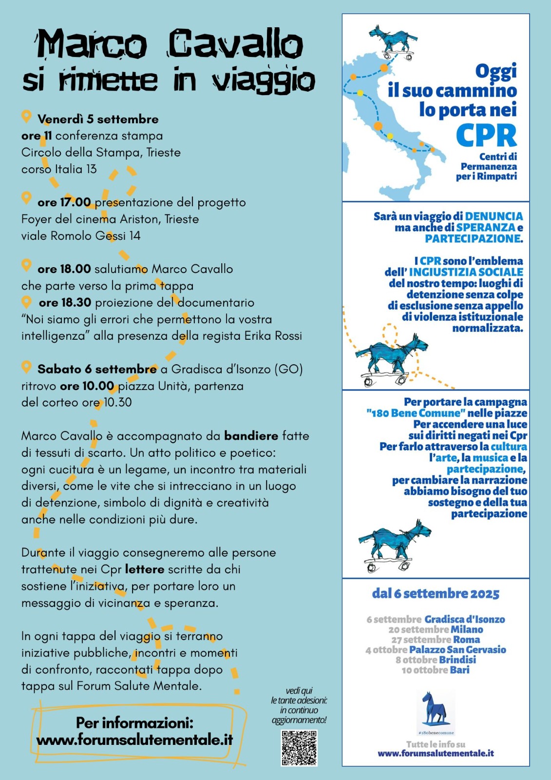 Alle ore 11, presso il Circolo della Stampa di Trieste (corso Italia 13, primo piano), verrà presentato ufficialmente il viaggio di Marco Cavallo nei Centri di Permanenza per il Rimpatrio (CPR) d’Italia. La conferenza stampa vedrà la partecipazione di Peppe Dell’Acqua, presidente del Forum Salute Mentale, Carla Ferrari Aggradi, responsabile del progetto, Gianfranco Schiavone, presidente di ICS e membro di ASGI, e altri interventi dal pubblico.
